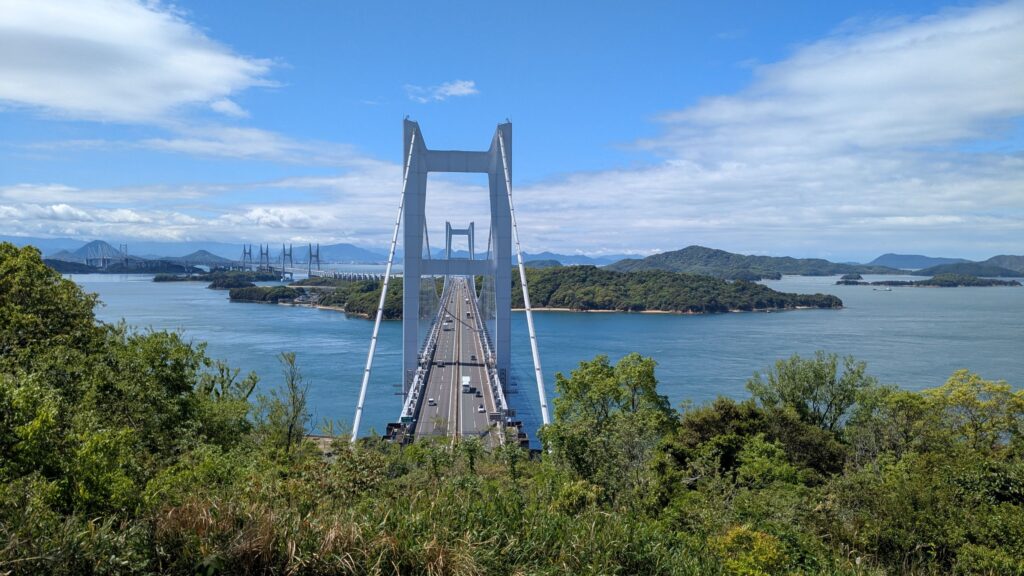 児島を訪れるなら、一度は見ておきたいのが瀬戸大橋の眺め。高台にある展望エリアからは、橋の構造と瀬戸内海の優しい光が重なり、写真1のようなダイナミックな景観が広がります。橋を見上げるのではなく“見下ろす”という特別な視界は、児島ならではの楽しみです。